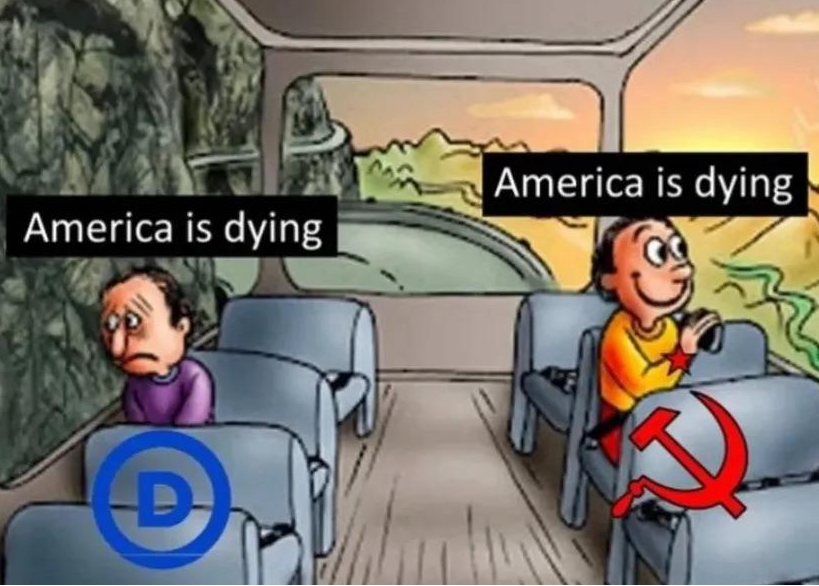 美国左派制作的漫画:同样认为“美国快完蛋了”的两种心态,死抱民主党自由派白左理念的人,和转向共产主义/社会主义理想的人